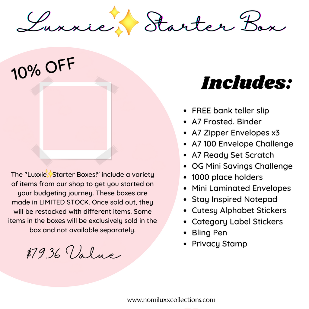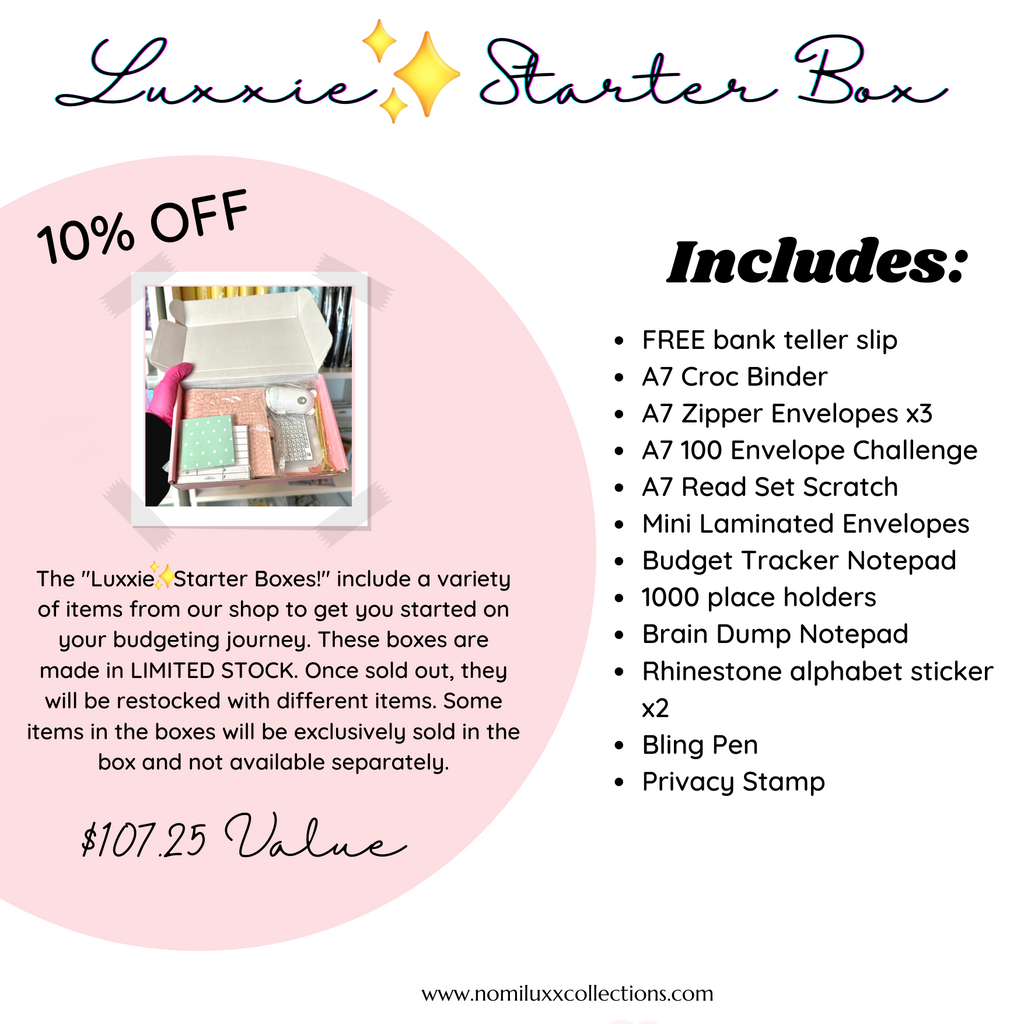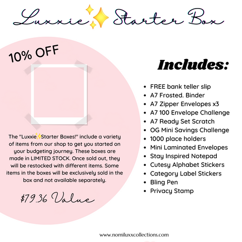 The "Luxxie ✨ Starter Boxes!" include a variety of items from our shop to get you started on your budgeting journey. These boxes are made in LIMITED STOCK and once sold out, they will be restocked with different items. Some items in the boxes will be exclusively sold in the box and not available separately.